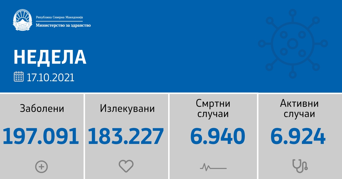 Вкупната бројка на КОВИД-дијагностицирани лица во нашата земја од почетокот на епидемијата изнесува 197.091 бројката на оздравени пациенти е 183.227, на починати е 6.940, а бројот на активни случаи изнесува 6.924.