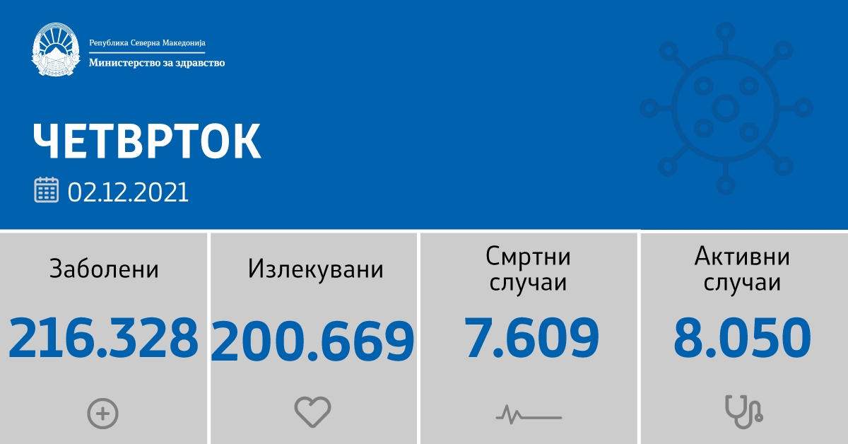 Вкупната бројка на КОВИД-дијагностицирани лица во нашата земја од почетокот на епидемијата изнесува 216.328, бројот на оздравени пациенти е 200.669, на починати е 7.609, а бројот на активни случаи изнесува 8.050.
