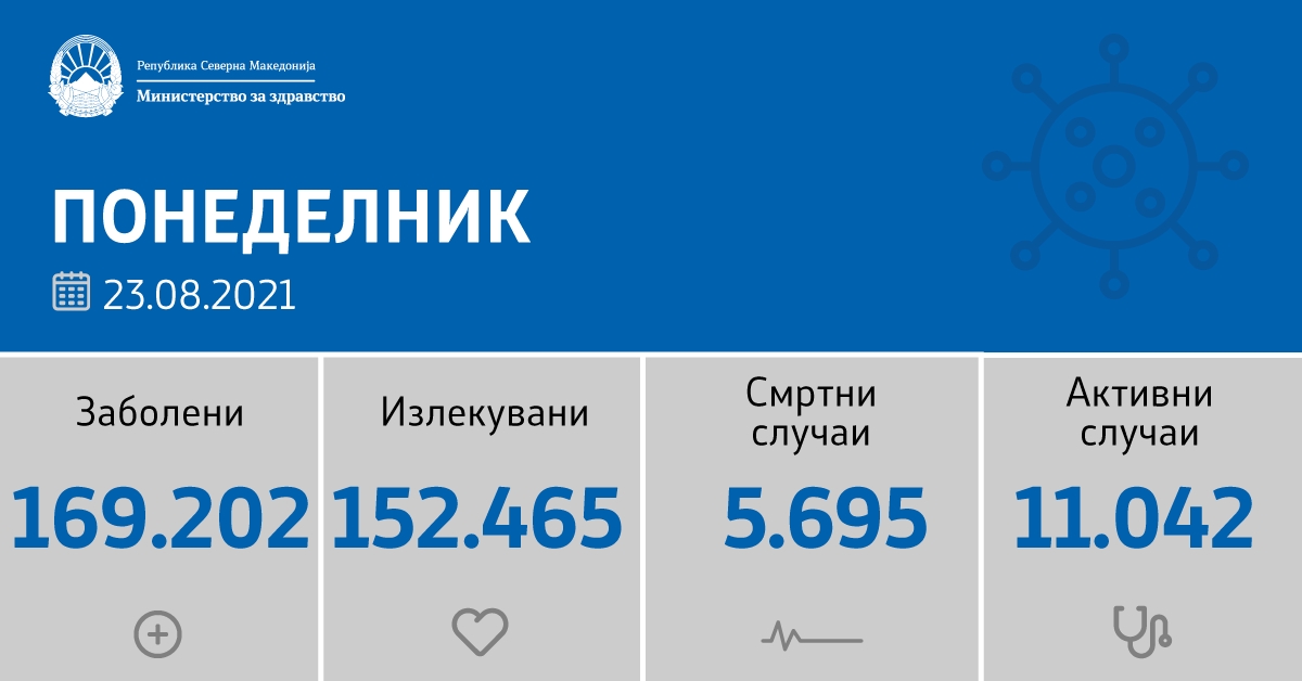 Вкупната бројка на КОВИД-дијагностицирани лица во нашата земја од почетокот на епидемијата изнесува 169.202, бројката на оздравени пациенти е 152.465, на починати е 5.695, а бројот на активни случаи изнесува 11.042.