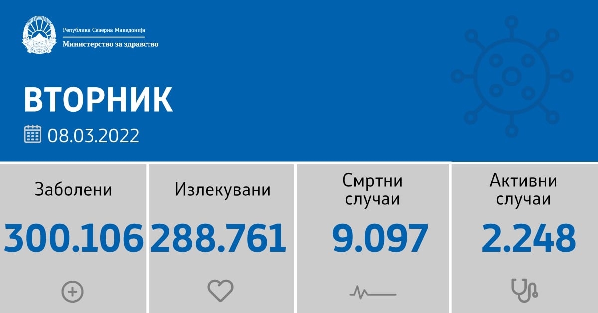 Вкупната бројка на КОВИД- дијагностицирани лица во нашата земја од почетокот на епидемијата изнесува 300.106, бројот на оздравени пациенти е 288.761, на починати е 9.097 а бројот на активни случаи изнесува 2.248.