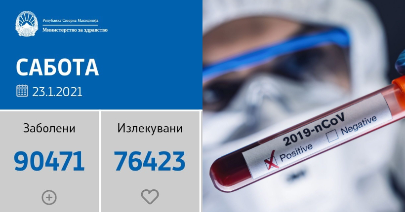 Вкупната бројка на ковид дијагностицирани во нашата земја од почетокот на епидемијата изнесува 90.471, бројката на оздравени пациенти е 76.423, на починати е 2.779, а бројот на активни случаи изнесува 11.269.