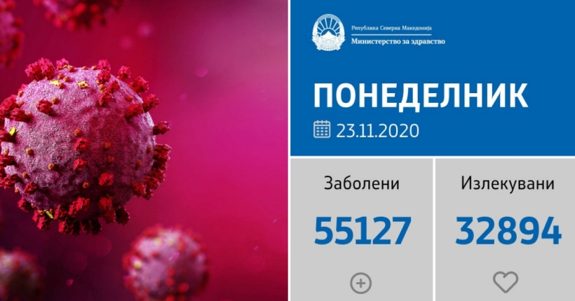 Вкупната бројка на ковид дијагностицирани во нашата земја од почетокот на епидемијата изнесува 55.127, бројката на оздравени пациенти е 32.894, на починати е 1.546, а бројот на активни случаи изнесува 20.687.