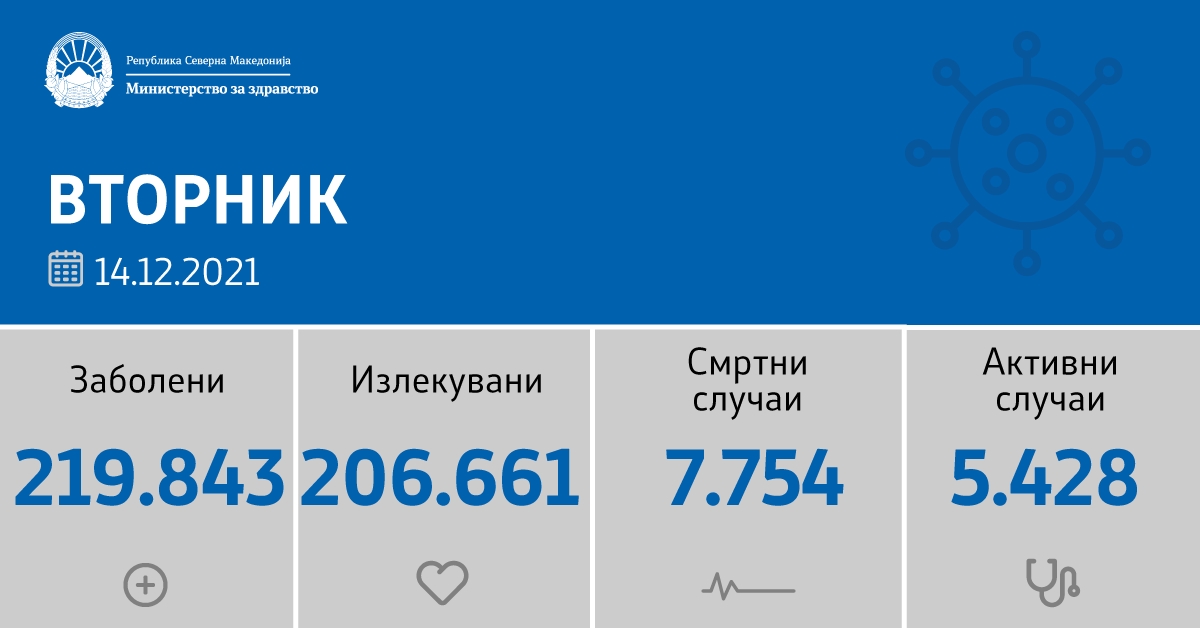 Вкупната бројка на КОВИД-дијагностицирани лица во нашата земја од почетокот на епидемијата изнесува 219.843, бројот на оздравени пациенти е 206.661, на починати е 7.754, а бројот на активни случаи изнесува 5.428.