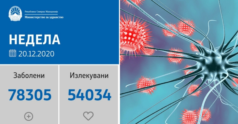Вкупната бројка на ковид дијагностицирани во нашата земја од почетокот на епидемијата изнесува 78.305, бројката на оздравени пациенти е 54.034, на починати е 2.292, а бројот на активни случаи изнесува 21.979.