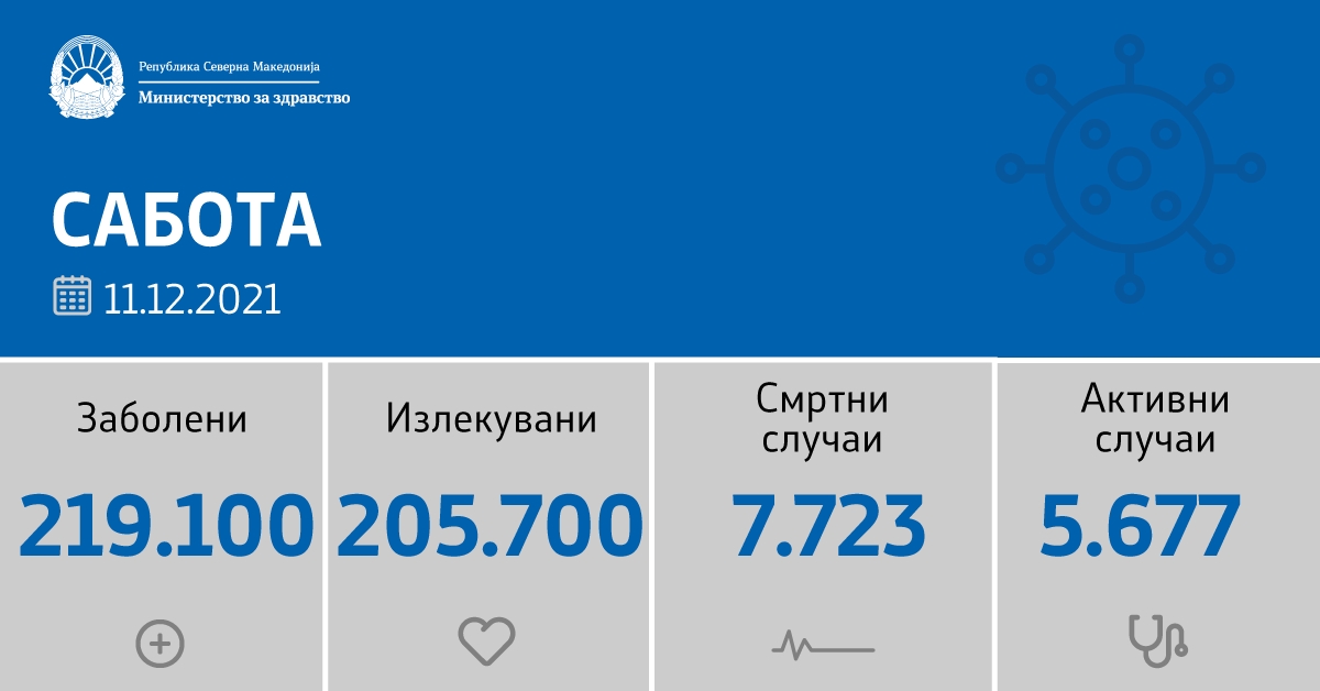 Вкупната бројка на КОВИД-дијагностицирани лица во нашата земја од почетокот на епидемијата изнесува 219.100, бројот на оздравени пациенти е 205.700, на починати е 7.723, а бројот на активни случаи изнесува 5.677.