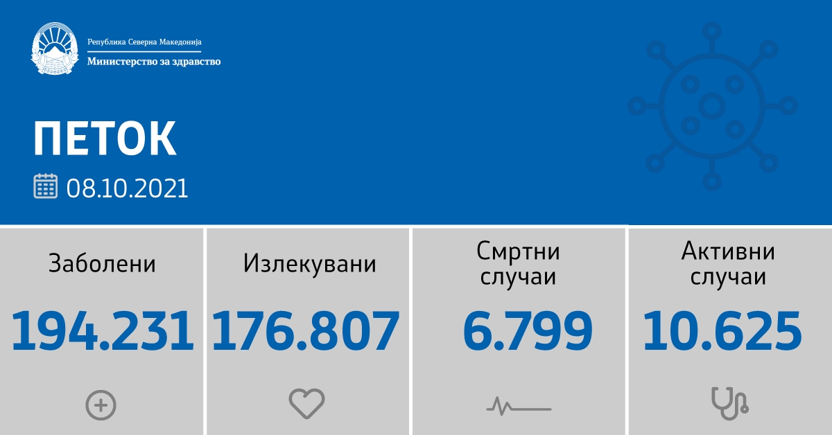 Вкупната бројка на КОВИД-дијагностицирани лица во нашата земја од почетокот на епидемијата изнесува 194.231 бројката на оздравени пациенти е 176.807, на починати е 6.799, а бројот на активни случаи изнесува 10.625.