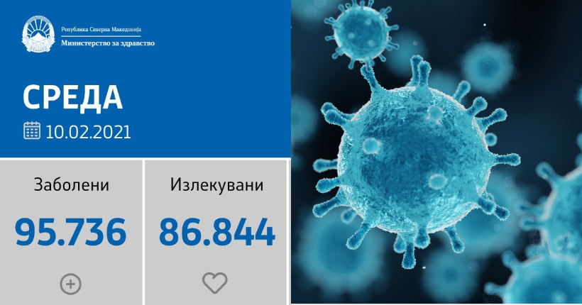 Вкупната бројка на КОВИД-дијагностицирани лица во нашата земја од почетокот на епидемијата изнесува 95.736, бројката на оздравени пациенти е 86.844, на починати е 2.959, а бројот на активни случаи изнесува 5.933.