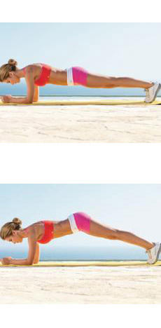 Застанете во положба како за склекови, а потоа потпрете ги лактите на подот. Рацете треба да ви бидат на иста ширина со рамената, а дланките свиткани во тупаници и насочени една кон друга. Стегнете ги стомачните мускули за телото да ви биде во права линија (слика 1).