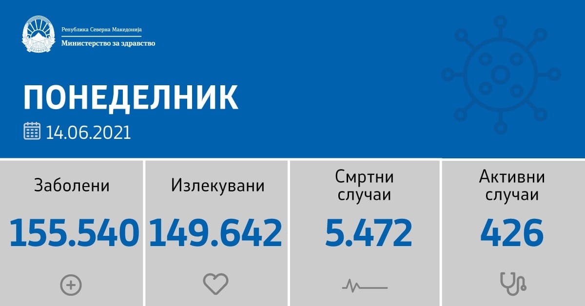 Вкупната бројка на КОВИД-дијагностицирани лица во нашата земја од почетокот на епидемијата изнесува 155.540, бројката на оздравени пациенти е 149.642, на починати е 5.472, а бројот на активни случаи изнесува 426.