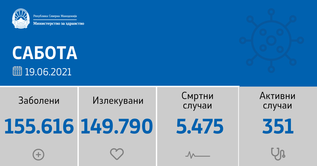 Вкупната бројка на КОВИД-дијагностицирани лица во нашата земја од почетокот на епидемијата изнесува 155.616, бројката на оздравени пациенти е 149.790, на починати е 5.475, а бројот на активни случаи изнесува 351.