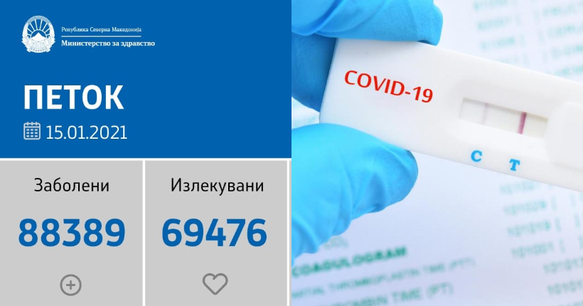 Вкупната бројка на ковид дијагностицирани во нашата земја од почетокот на епидемијата изнесува 88.389, бројката на оздравени пациенти е 69.476, на починати е 2.682, а бројот на активни случаи изнесува 16.231.