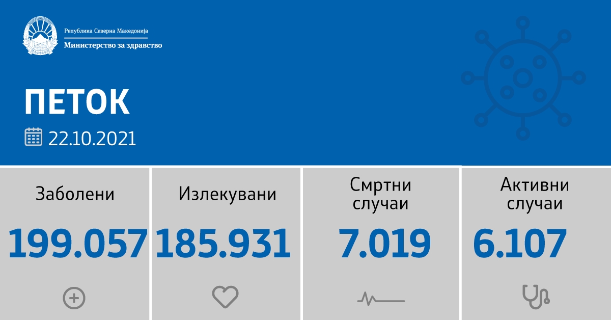 Дополнително, согласно Регистарот на умрени лица со дијагноза КОВИД-19 од Мој Термин, пријавени се уште 3 починати лица, со датум на смрт од 31.08.2021 до 16.10.2021 година. Регистрирани се 2 од Скопје и едно од Кичево, на возраст од 80 до 93 години. Од нив, две се починати во домашни услови и едно лице во болнички услови.