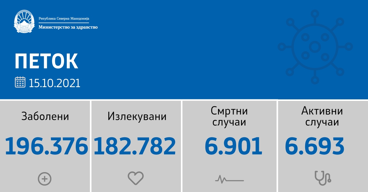 Вкупната бројка на КОВИД-дијагностицирани лица во нашата земја од почетокот на епидемијата изнесува 196.376 бројката на оздравени пациенти е 182.782, на починати е 6.901, а бројот на активни случаи изнесува 6.693.