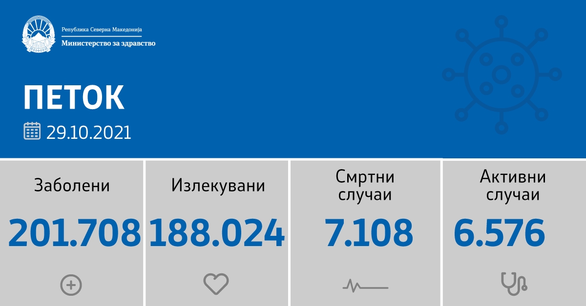 Вкупната бројка на КОВИД-дијагностицирани лица во нашата земја од почетокот на епидемијата изнесува 201.708, бројот на оздравени пациенти е 188.024, на починати е 7.108, а бројот на активни случаи изнесува 6.576.