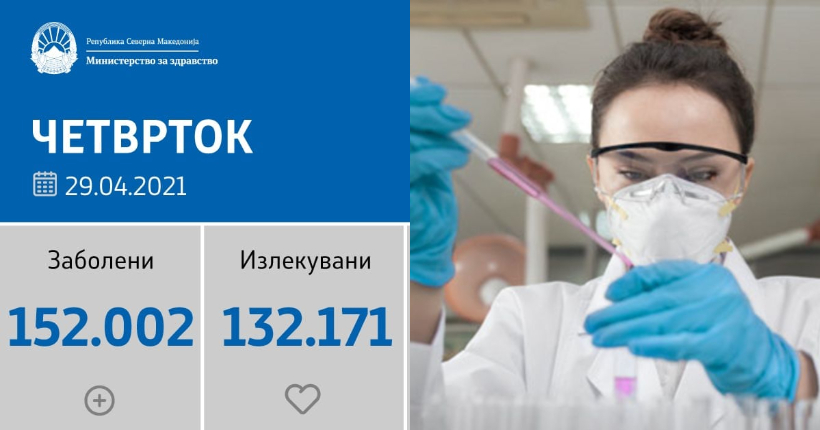 Вкупната бројка на Ковид-дијагностицирани лица во нашата земја од почетокот на епидемијата изнесува 152.002, бројката на оздравени пациенти е 132.171, на починати е 4.818, а бројот на активни случаи изнесува 15.013.
