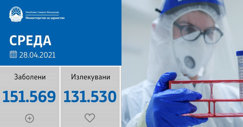 Вкупната бројка на Ковид-дијагностицирани лица во нашата земја од почетокот на епидемијата изнесува 151.569, бројката на оздравени пациенти е 131.530, на починати е 4.772, а бројот на активни случаи изнесува 15.267.