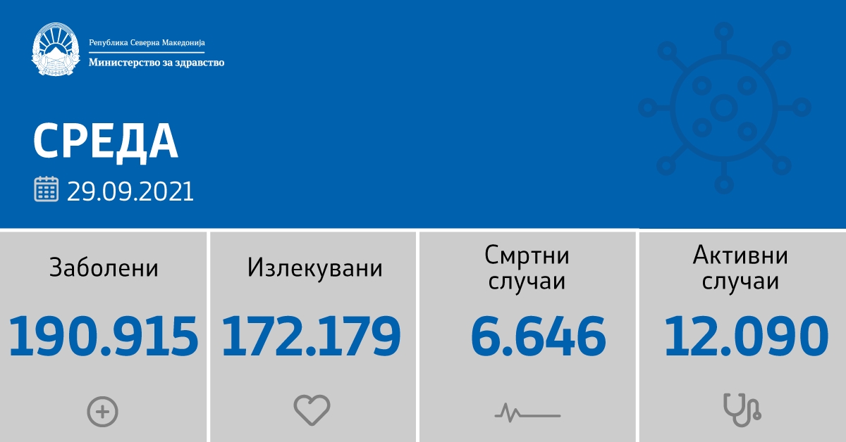 Вкупната бројка на КОВИД-дијагностицирани лица во нашата земја од почетокот на епидемијата изнесува 190.915 бројката на оздравени пациенти е 172.179, на починати е 6.646, а бројот на активни случаи изнесува 12.090.