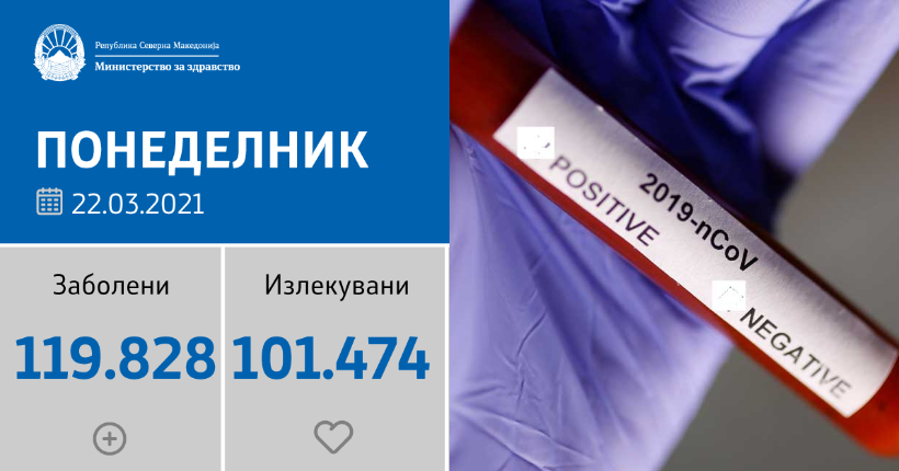Вкупната бројка на КОВИД-дијагностицирани лица во нашата земја од почетокот на епидемијата изнесува 119.828, бројката на оздравени пациенти е 101.474, на починати е 3.503, а бројот на активни случаи изнесува 14.851.