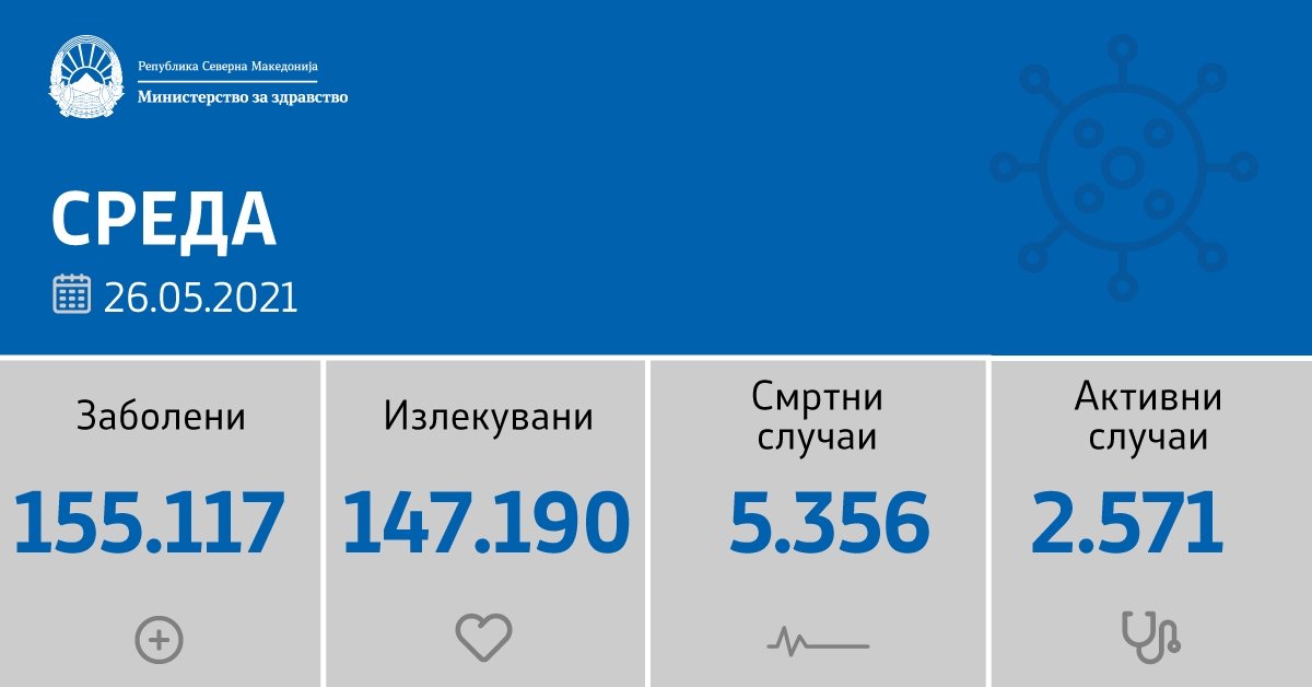 Вкупната бројка на КОВИД-дијагностицирани лица во нашата земја од почетокот на епидемијата изнесува 155.117, бројката на оздравени пациенти е 147.190, на починати е 5.356, а бројот на активни случаи изнесува 2.571.