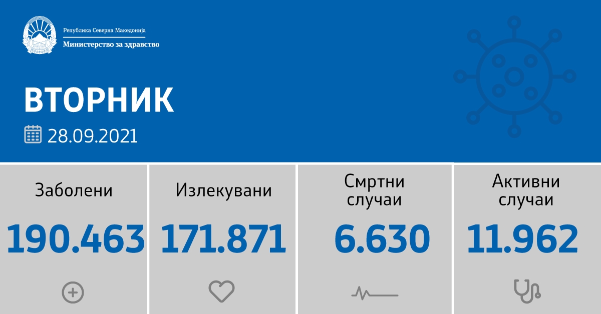 Вкупната бројка на КОВИД-дијагностицирани лица во нашата земја од почетокот на епидемијата изнесува 190.463 бројката на оздравени пациенти е 171.871, на починати е 6.630, а бројот на активни случаи изнесува 11.962.