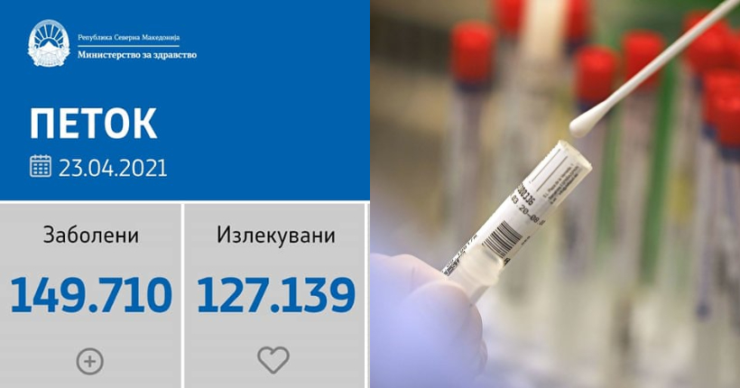 Вкупната бројка на Ковид дијагностицирани лица во нашата земја од почетокот на епидемијата изнесува 149.710, бројката на оздравени пациенти е 127.139, на починати е 4.628, а бројот на активни случаи изнесува 17.943.