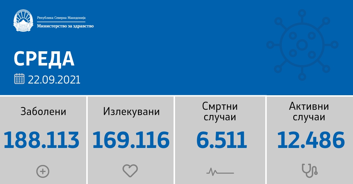 Вкупната бројка на КОВИД-дијагностицирани лица во нашата земја од почетокот на епидемијата изнесува 188.113 бројката на оздравени пациенти е 169.116, на починати е 6.511, а бројот на активни случаи изнесува 12.486.