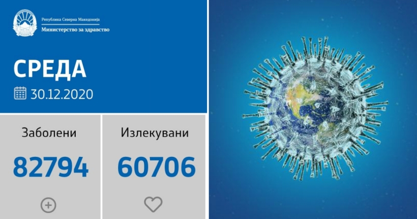 Вкупната бројка на ковид дијагностицирани во нашата земја од почетокот на епидемијата изнесува 82.794, бројката на оздравени пациенти е 60.706, на починати е 2.488, а бројот на активни случаи изнесува 19.600.
