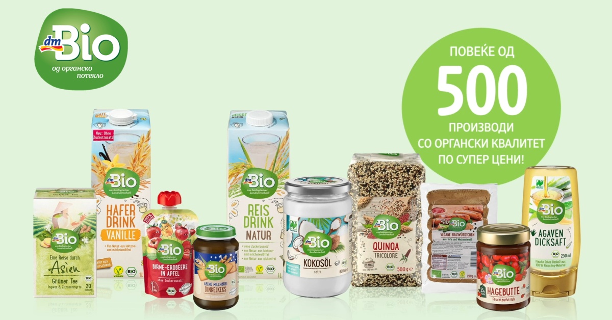 Сопствена трговска марка со најголем асортиман на органски производи во земјава е dmBio, која можете да ја најдете во сите дрогерии на dm. Со речиси 300 производи од органско потекло, dmBio Ви овозможува да го збогатите секој оброк со неверојатни природни вкусови, без разлика дали се работи за житарки, јаткасти плодови, тестенини или готови оброци. Доколку мислите дека сега е правото време за стекнување на поздрави навики, вистинско време е да ги пробате производите од асортиманот на dmBio.