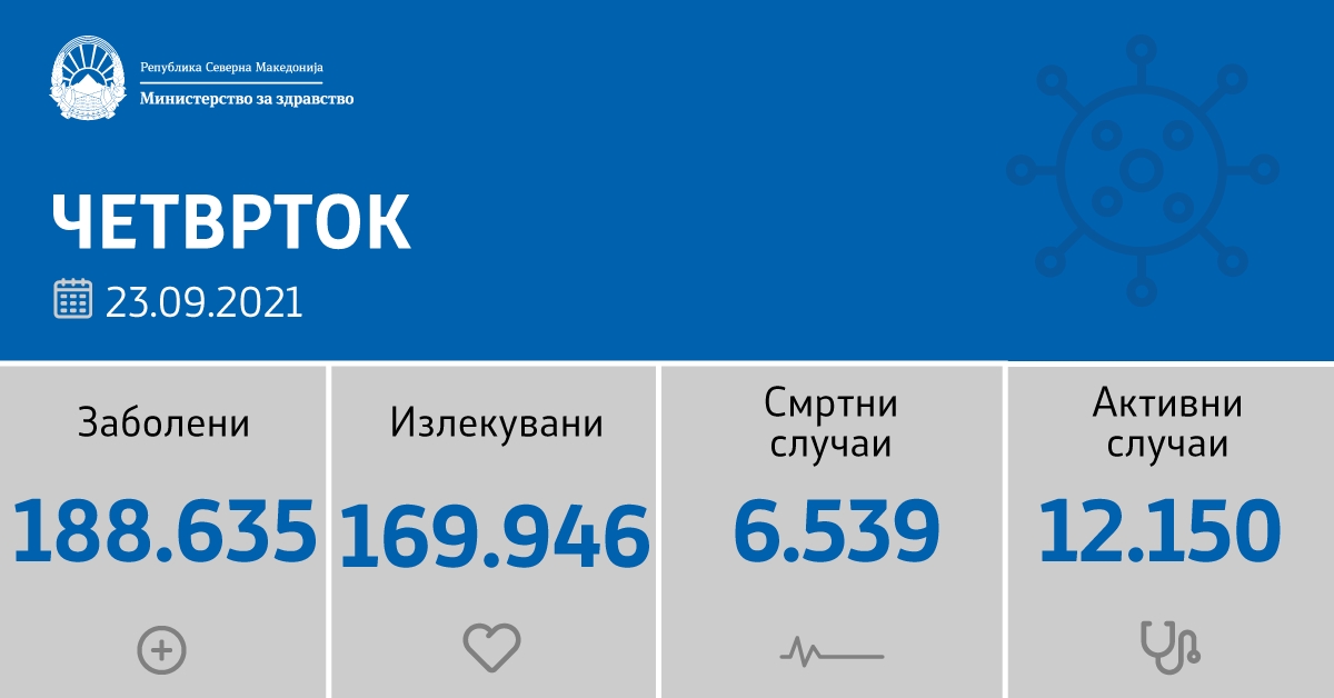 Вкупната бројка на КОВИД-дијагностицирани лица во нашата земја од почетокот на епидемијата изнесува 188.635 бројката на оздравени пациенти е 169.946, на починати е 6.539, а бројот на активни случаи изнесува 12.150.