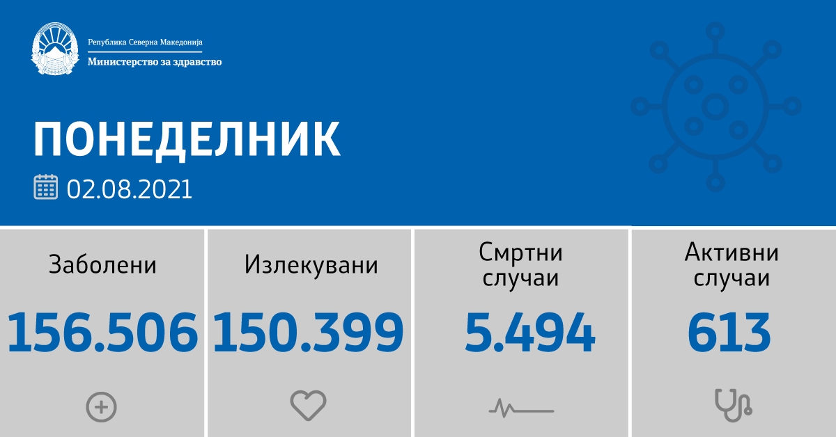 Вкупната бројка на КОВИД-дијагностицирани лица во нашата земја од почетокот на епидемијата изнесува 156.506 бројката на оздравени пациенти е 150.399, на починати е 5.494, а бројот на активни случаи изнесува 613.