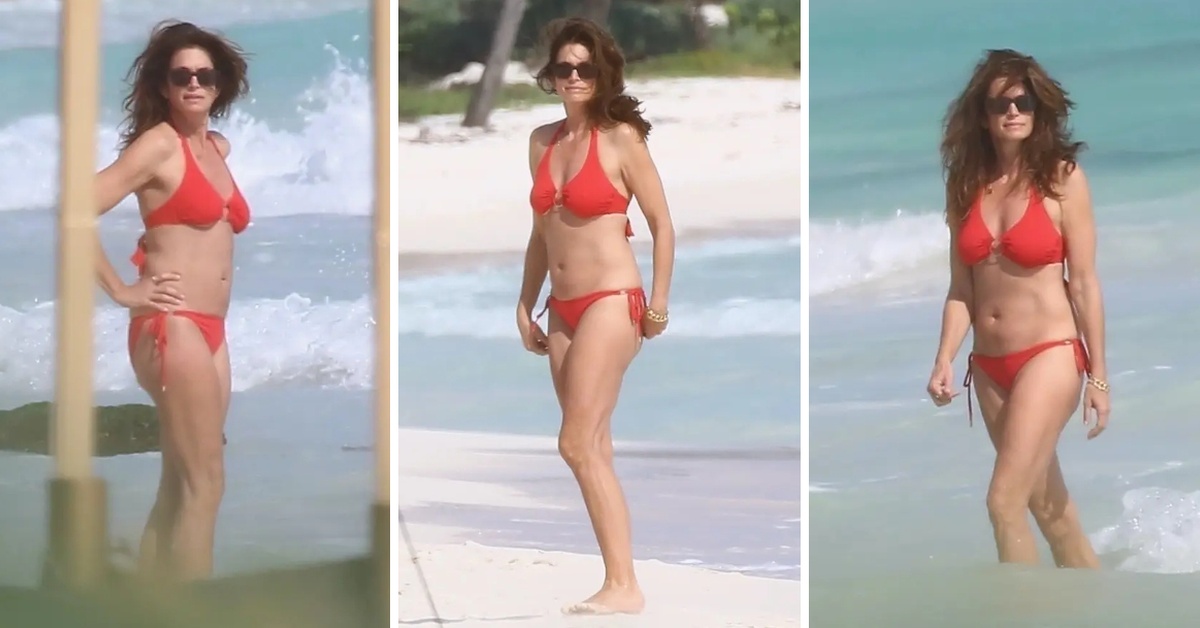 58-годишниот супермодел беше фотографиран од папараците додека се разладуваше во бистрите води со својот сопруг.