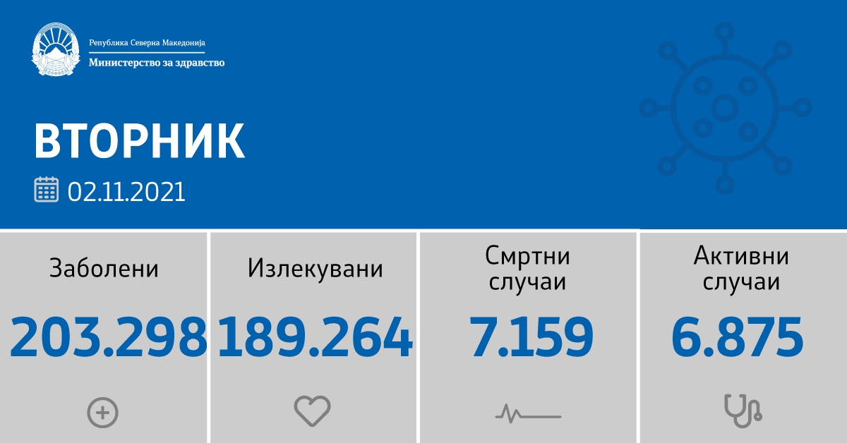 Вкупната бројка на КОВИД-дијагностицирани лица во нашата земја од почетокот на епидемијата изнесува 203.298, бројот на оздравени пациенти е 189.264, на починати е 7.159, а бројот на активни случаи изнесува 6.875.