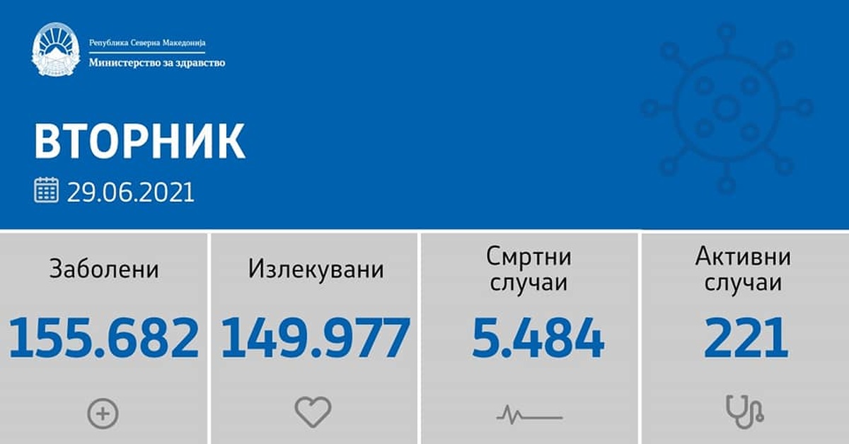Вкупната бројка на КОВИД-дијагностицирани лица во нашата земја од почетокот на епидемијата изнесува 155.682, бројката на оздравени пациенти е 149.977, на починати е 5.484, а бројот на активни случаи изнесува 221.
