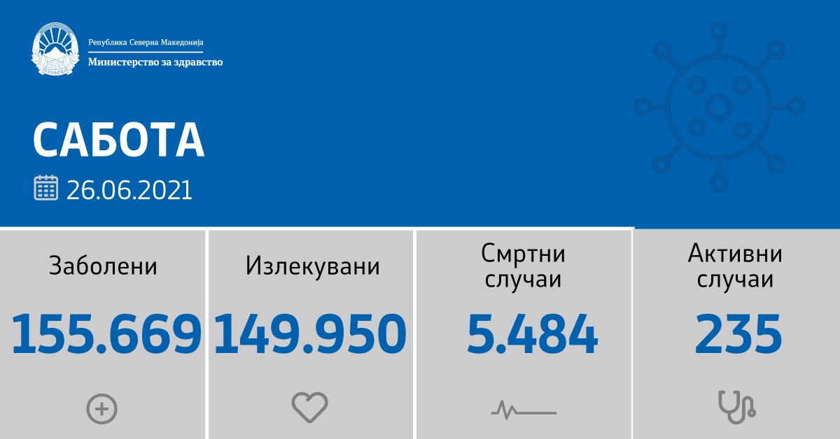 Вкупната бројка на КОВИД-дијагностицирани лица во нашата земја од почетокот на епидемијата изнесува 155.669, бројката на оздравени пациенти е 149.950, на починати е 5.484, а бројот на активни случаи изнесува 235.