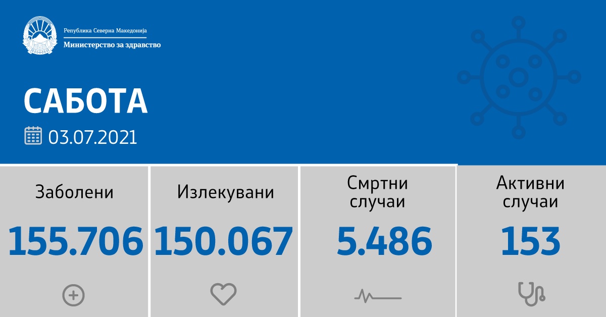 Вкупната бројка на КОВИД-дијагностицирани лица во нашата земја од почетокот на епидемијата изнесува 155.706, бројката на оздравени пациенти е 150.067, на починати е 5.486, а бројот на активни случаи изнесува 153.