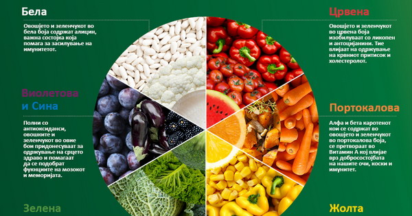Различни витамини и хранливи состојки се адекватни за различни делови од нашето тело, што значи дека е потребна комбинација на храна со различни бои за да се добие вистинската доза на витамини.