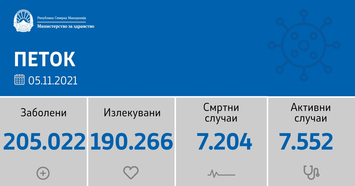 Вкупната бројка на КОВИД-дијагностицирани лица во нашата земја од почетокот на епидемијата изнесува 205.022, бројот на оздравени пациенти е 190.266, на починати е 7.204, а бројот на активни случаи изнесува 7.552.
