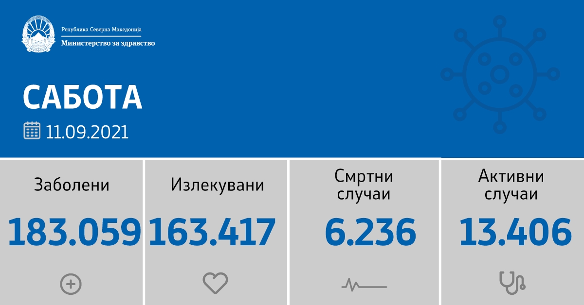 Вкупната бројка на КОВИД-дијагностицирани лица во нашата земја од почетокот на епидемијата изнесува 183.059, бројката на оздравени пациенти е 163.417, на починати е 6.236, а бројот на активни случаи изнесува 13.406.