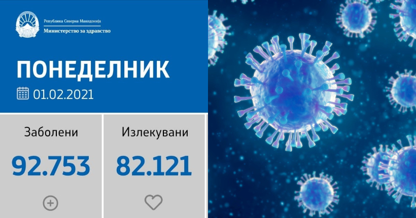 Вкупната бројка на КОВИД-дијагностицирани лица во нашата земја од почетокот на епидемијата изнесува 92.753, бројката на оздравени пациенти е 82.121, на починати е 2.866, а бројот на активни случаи изнесува 7.766.