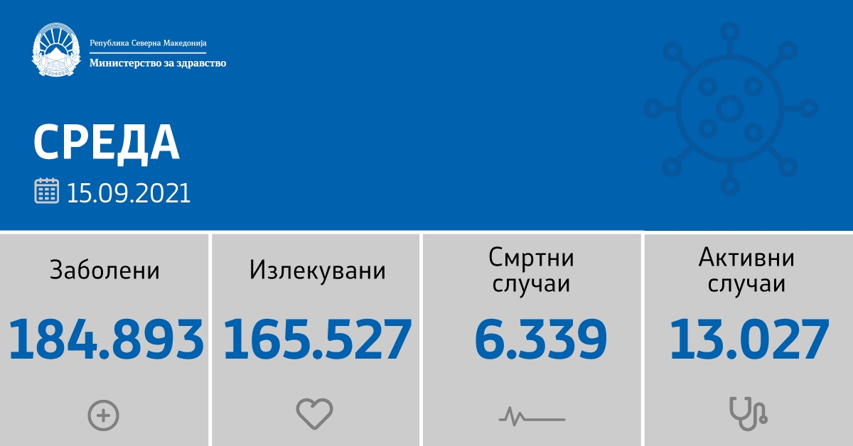 Вкупната бројка на КОВИД-дијагностицирани лица во нашата земја од почетокот на епидемијата изнесува 184.893 бројката на оздравени пациенти е 165.527, на починати е 6.339, а бројот на активни случаи изнесува 13.027.