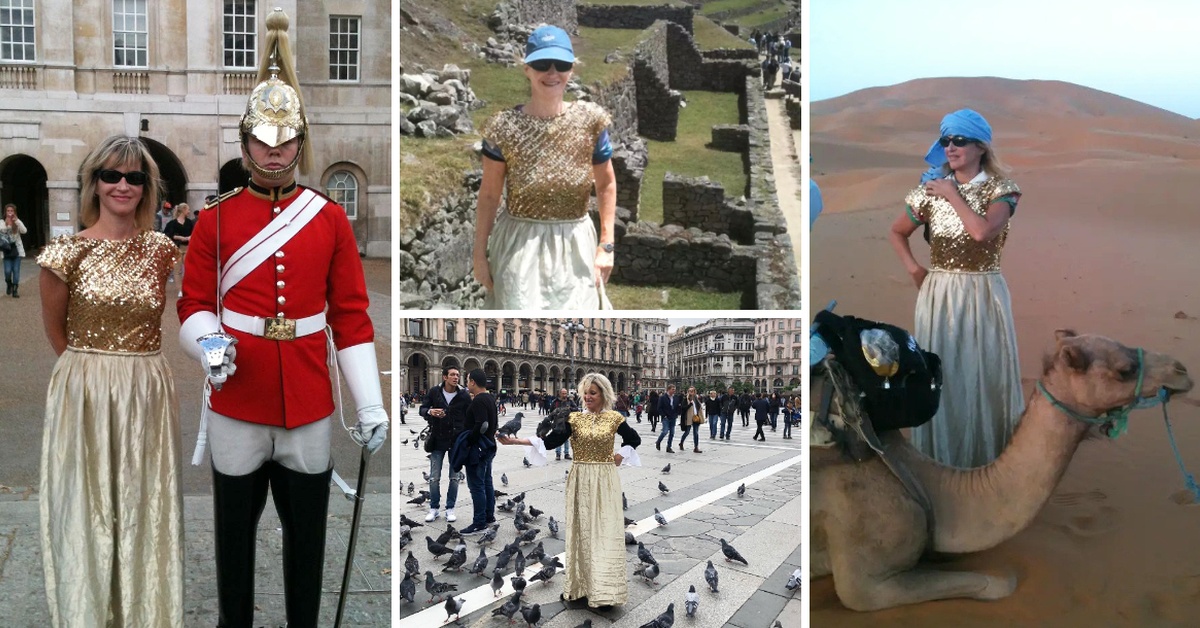 62-годишната жена патува низ светот и се фотографира на различни локации облечена во истиот фустан кој го носела како деверуша на свадбата на блиска пријателка пред 35 години.