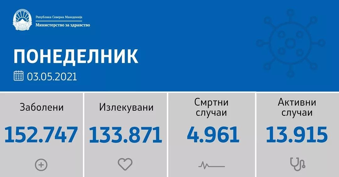 Вкупната бројка на КОВИД-дијагностицирани лица во нашата земја од почетокот на епидемијата изнесува 152.747, бројката на оздравени пациенти е 133.871, на починати е 4.961, а бројот на активни случаи изнесува 13.915.