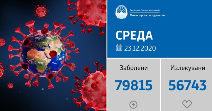 Вкупната бројка на ковид дијагностицирани во нашата земја од почетокот на епидемијата изнесува 79.815, бројката на оздравени пациенти е 56.743, на починати е 2.354, а бројот на активни случаи изнесува 20.718.