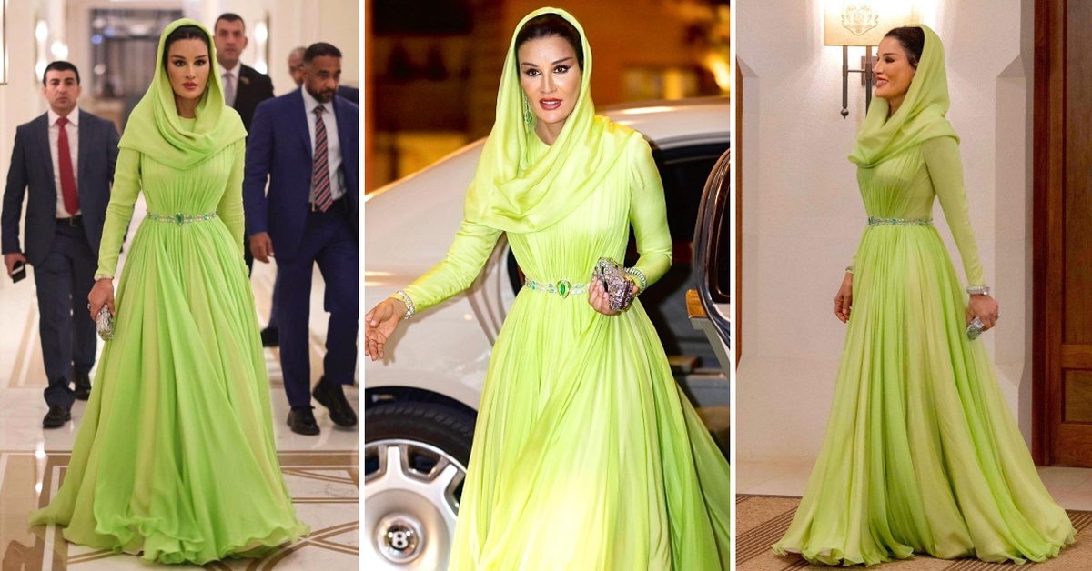 63-годишната поранешна прва дама на Катар и мајка на сегашниот емир мамеше погледи во впечатлива неонско-зелена креација и марама на главата.