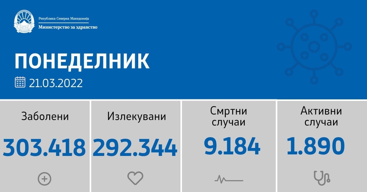 Вкупната бројка на КОВИД-дијагностицирани лица во нашата земја од почетокот на епидемијата изнесува 303.418, бројот на оздравени пациенти е 292.344, на починати е 9.184, а бројот на активни случаи изнесува 1.890.