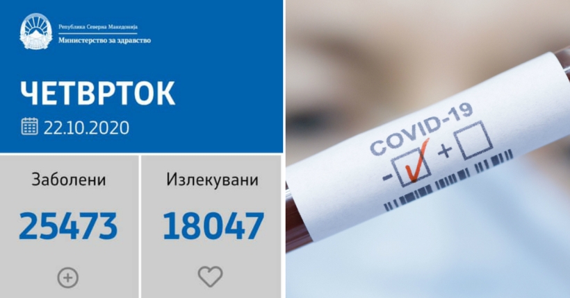 Вкупната бројка на ковид дијагностицирани во нашата земја од почетокот на епидемијата изнесува 25.473, бројката на оздравени пациенти е 18.047, на починати е 874, а во моментов бројот на активни случаи во земјата изнесува 6.552.