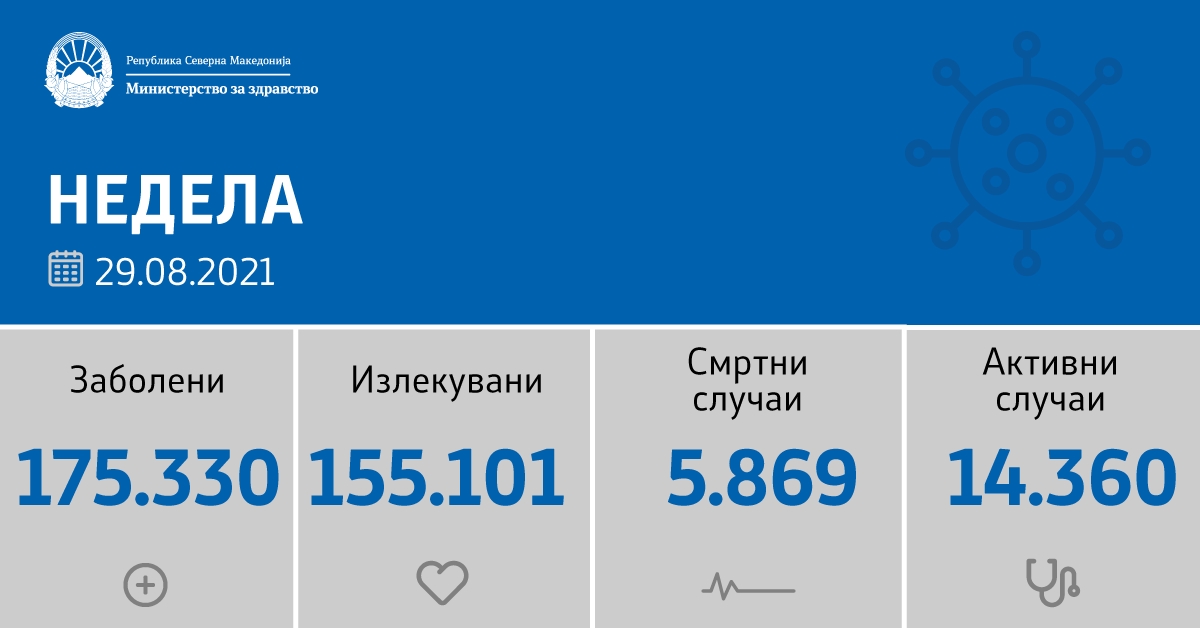 Вкупната бројка на КОВИД-дијагностицирани лица во нашата земја од почетокот на епидемијата изнесува 175.330, бројката на оздравени пациенти е 155.101, на починати е 5.869, а бројот на активни случаи изнесува 14.360.