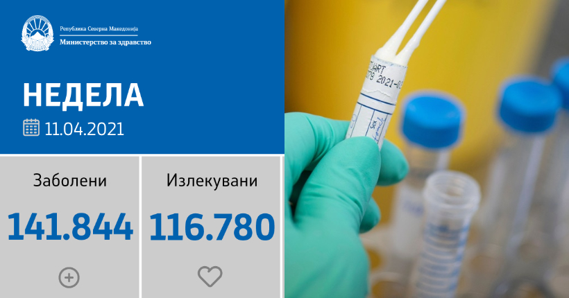Вкупната бројка на КОВИД-дијагностицирани лица во нашата земја од почетокот на епидемијата изнесува 141.844, бројката на оздравени пациенти е 116.780, на починати е 4.228, а бројот на активни случаи изнесува 20.836.