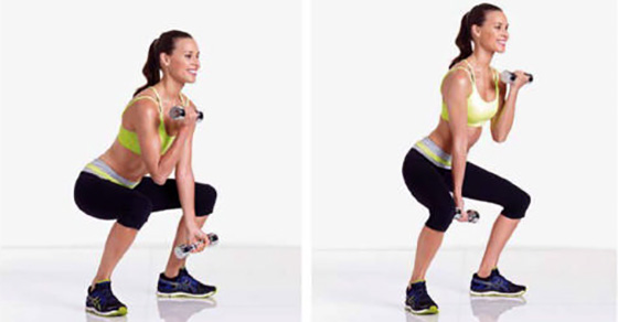 Застанете исправени. Стапалата поставете ги на ширина на колковите, а во рацете земете мали тегови и држете ги пред колковите. Дланките треба да ви се насочени нанапред. Додека чучнувате, подигнете го тегот со десната рака кон рамото (слика а).