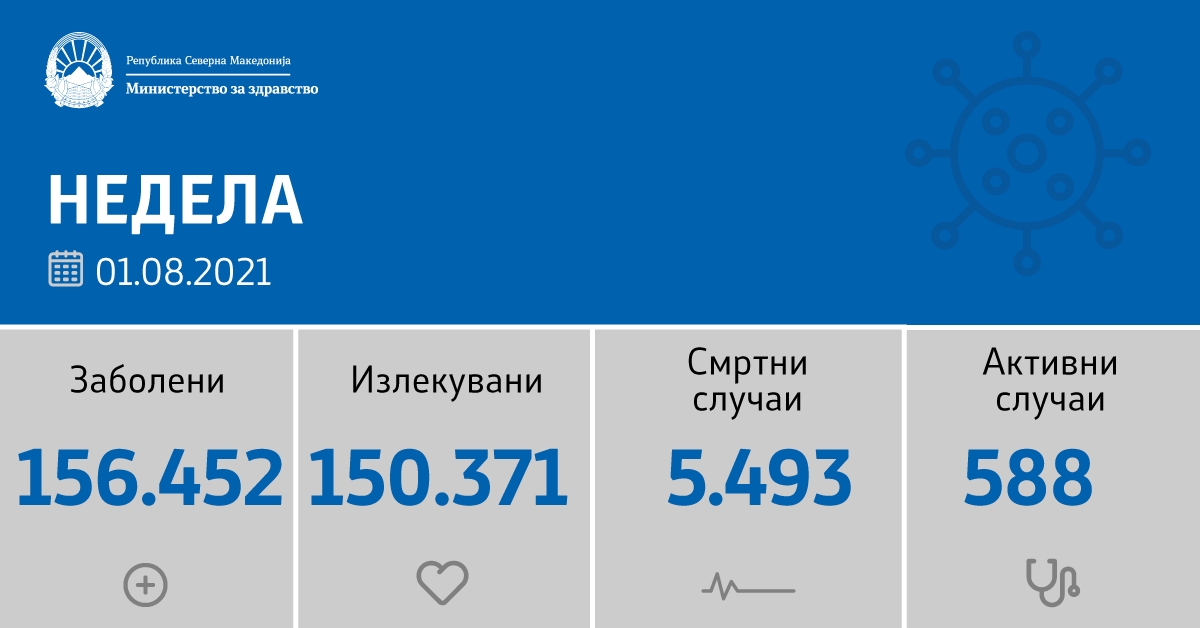 Вкупната бројка на КОВИД-дијагностицирани лица во нашата земја од почетокот на епидемијата изнесува 156.452 бројката на оздравени пациенти е 150.371, на починати е 5.493, а бројот на активни случаи изнесува 588.